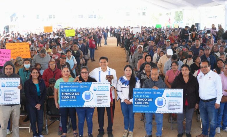 Santa Cruz Xoxocotlán, Oax., 28 de feb. — Como parte del programa estatal «Agua para Todos», el gobernador Salomón Jara Cruz y la presidenta municipal de Xoxocotlán, Nancy Benítez Zárate, entregaron mil 100 tinacos para beneficiar a igual número de familias en el aprovechamiento del vital líquido.
