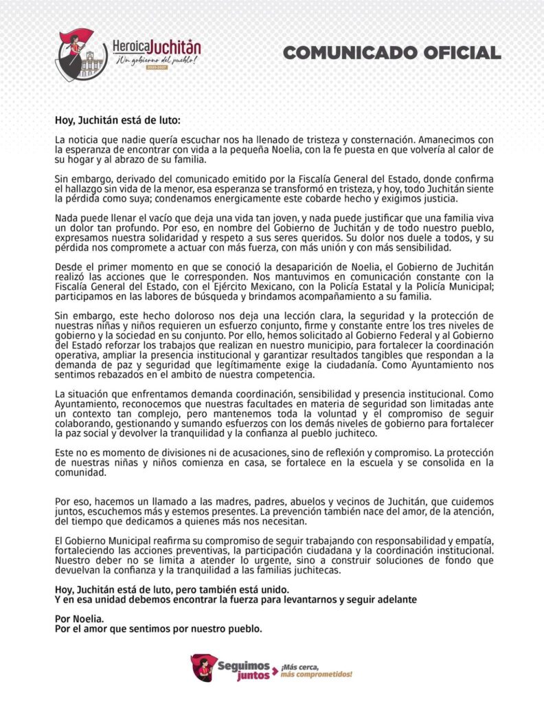 Desde el primer momento, el Gobierno de Juchitán participó en las labores de búsqueda y mantuvo coordinación constante con la Fiscalía General del Estado, el Ejército Mexicano, la Policía Estatal y la Policía Municipal, además de brindar acompañamiento a los familiares de la menor.